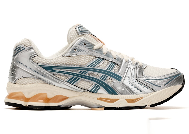 - Men's ASICS GelKayano 14 Teal Gold Sneakers in Birch/Pure Silver(1203A537-109)