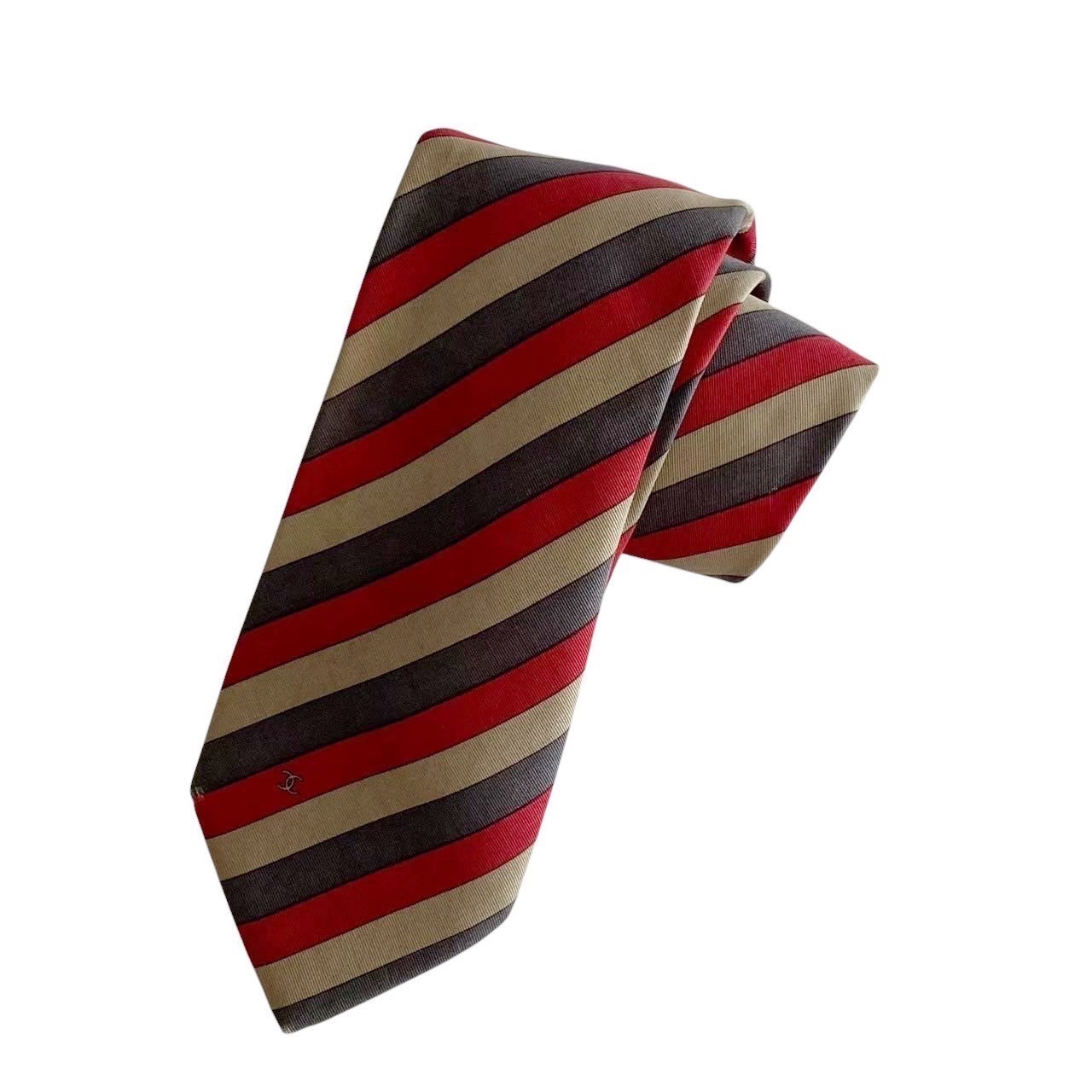 - 「中古」CHANEL シャネル ネクタイ ハイブランド 小物 レッド 赤 グレー 灰 カーキ 緑 斜めのストライプ スーツ ファション ビジネス 紳士 メンズ