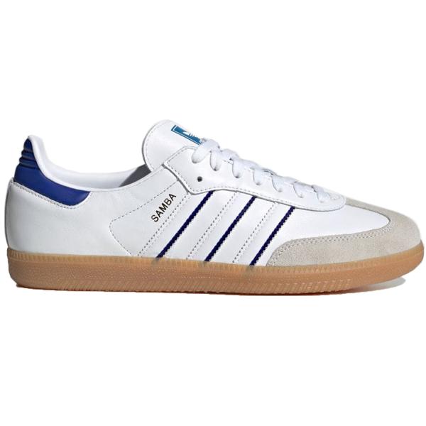 - Men's Adidas Samba Leather Sneakers in Cloud White/Lucid Blue/Gum(IG2339)