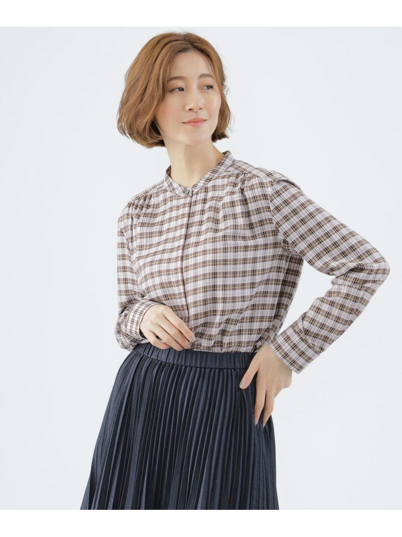 - ミニタータンチェックバンドカラーシャツ TRANS WORK トランスワーク トップス シャツ・ブラウス ネイビー グレー[Rakuten Fashion]