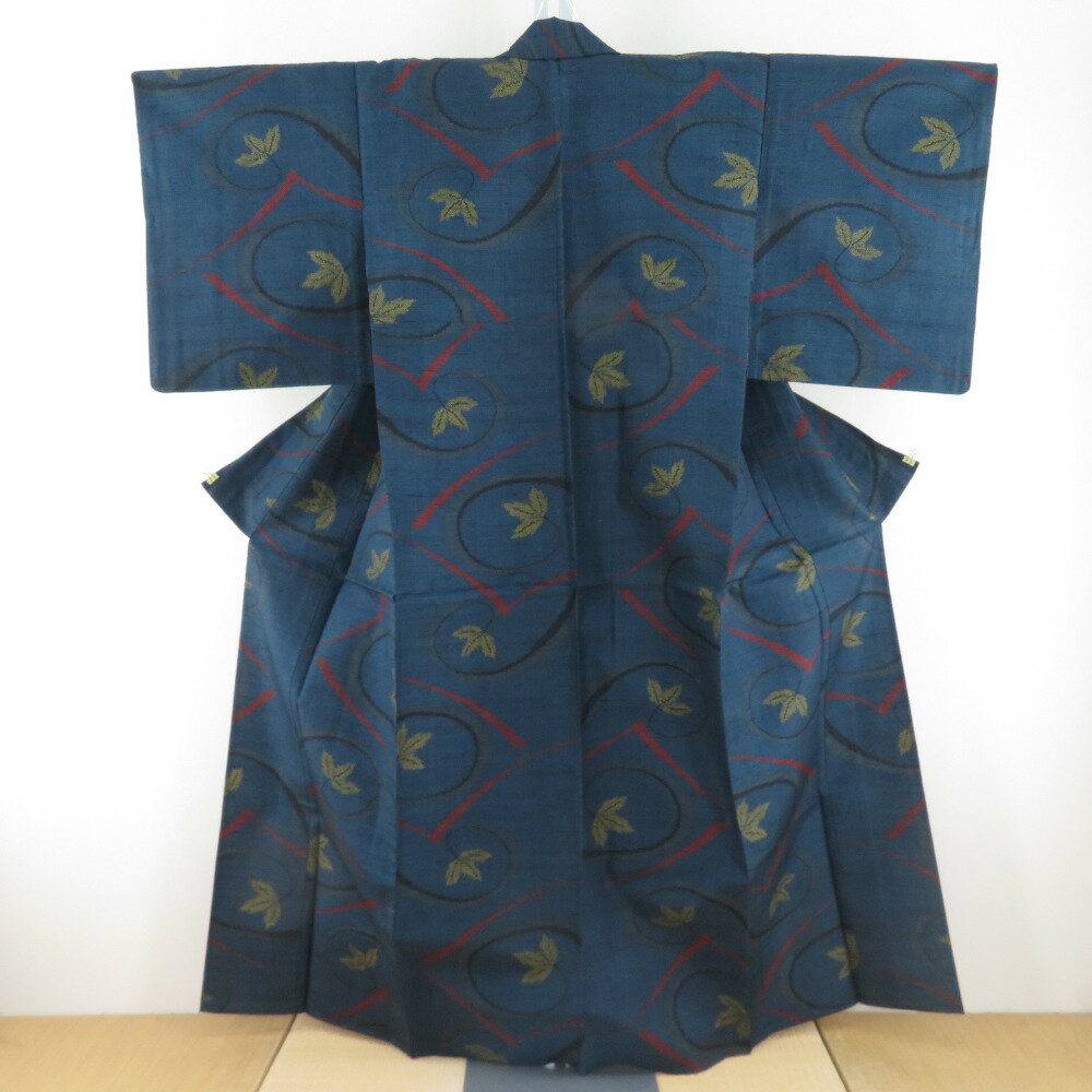 - 紬 着物 枝模様 紺色x赤色x黄色x黒色 単衣 バチ衿 絹 仕立て上がり着物 身丈158cm