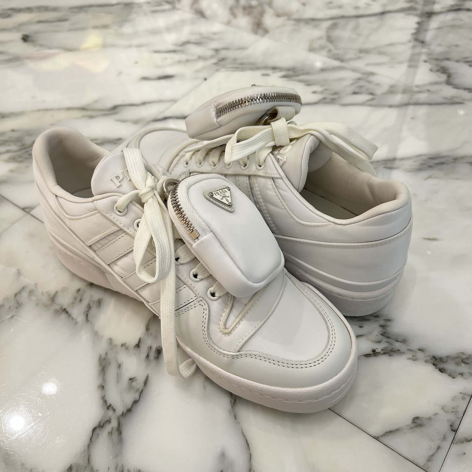 - プラダ×アディダス Re Nylon リ ナイロン レザー×ナイロン スニーカー 22cm レディース ホワイト フォーラム 2EG390 トライアングルロゴ ポーチ着脱可 箱 保存袋あり
