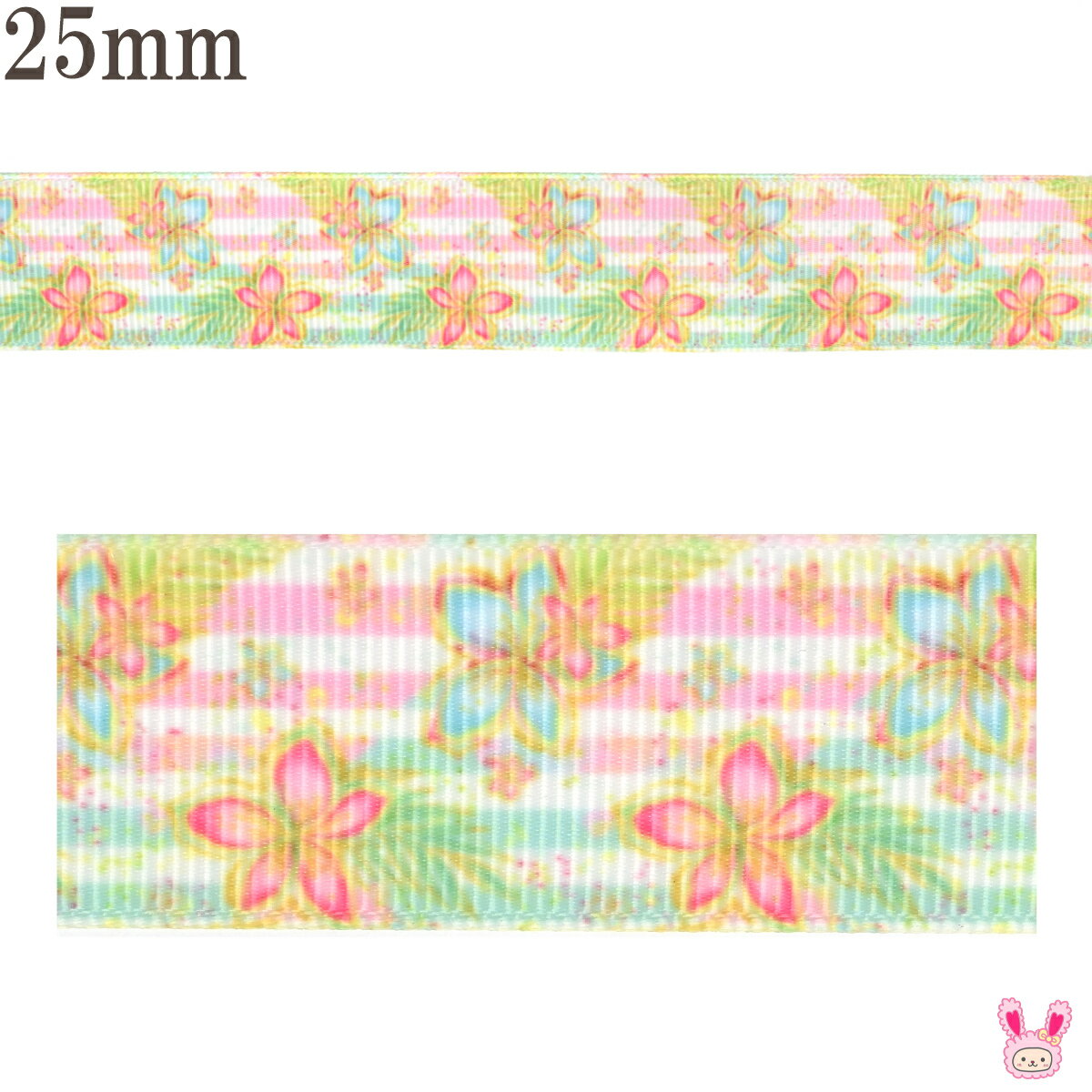 - プリントリボン 南国風2色のお花とボーダーリボン 幅25mm 1m単位 切り売り (2m以上)