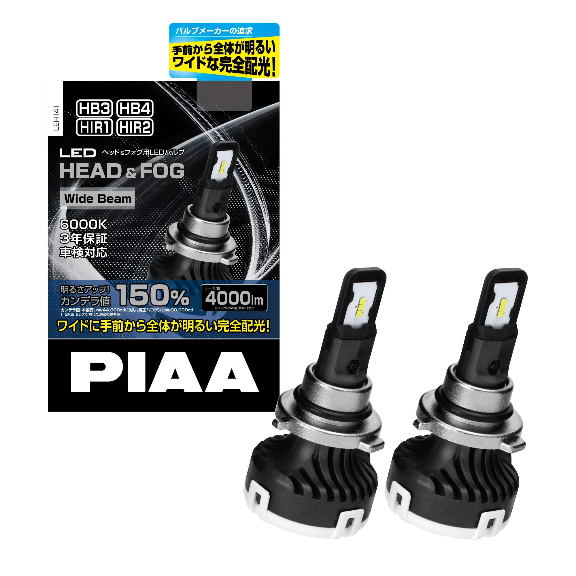 - PIAA ヘッドライト/フォグランプ用 LEDバルブ 6000K 4000lm※ HB3/HB4/HIR1/HIR2 12V 20W 車検対応 3年保証 プレミアム仕様・ワイドビーム市街走行向け LEH141