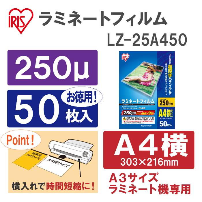 - アイリスオーヤマ ラミネートフィルム 横型 250ミクロン A4サイズ 50枚入り LZ-25A450 539614