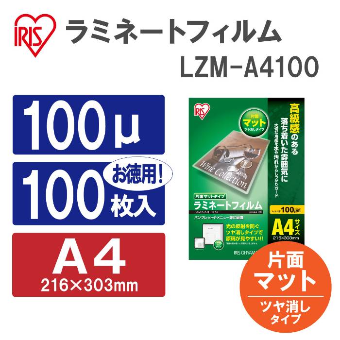 - アイリスオーヤマ ラミネートフィルム 片面マット 100ミクロン B4サイズ 100枚入り LZM-B4100 539611