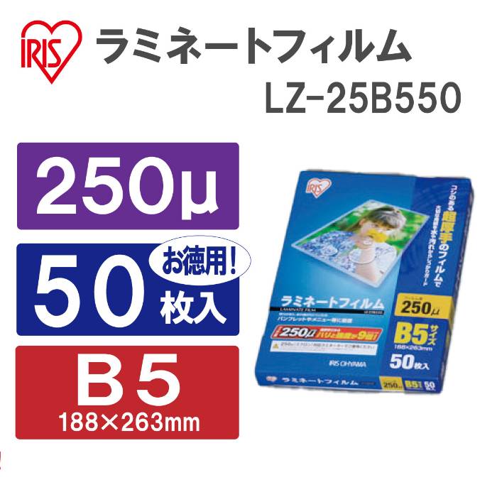 - アイリスオーヤマ ラミネートフィルム 250ミクロン B5サイズ 50枚入り LZ-25B550 1セット(10点) 539613