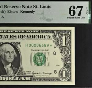 - 1969 $1 FRN セントルイス PMG 67EPQ トップポップ 最高級ローシリアルナンバー スター 00006689*