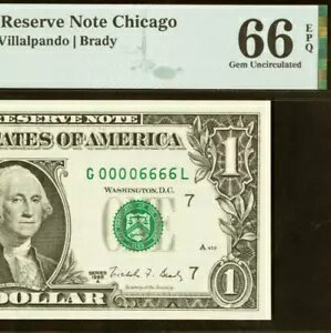 - 1988A 1ドル連邦準備銀行券 - PMG 66EPQ - ダブルクワッド シリアル番号 00006666