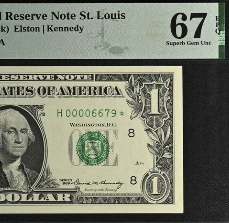 - 1969 $1 FRN セントルイス PMG 67EPQ トップポップ 最高級ローシリアルナンバー スター 00006679*