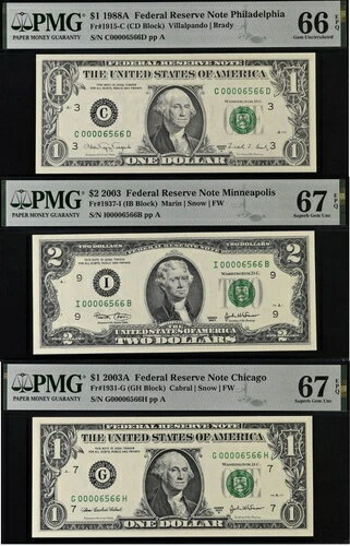 - 2003 $2 PMG 67EPQ 1988A & 2003A $1 67EPQ - 3 マッチングローシリアル番号 00006566
